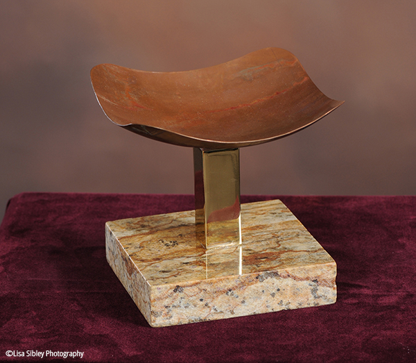 Earthly Offering, 6 inch natural copper, suspended by solid brass, with a Brazilian granite pedestal.