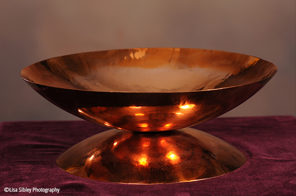 Reflecting Bowl - Hand hammered 9 inch copper bowl with hand torched edges, sitting on a mirror image of itself.